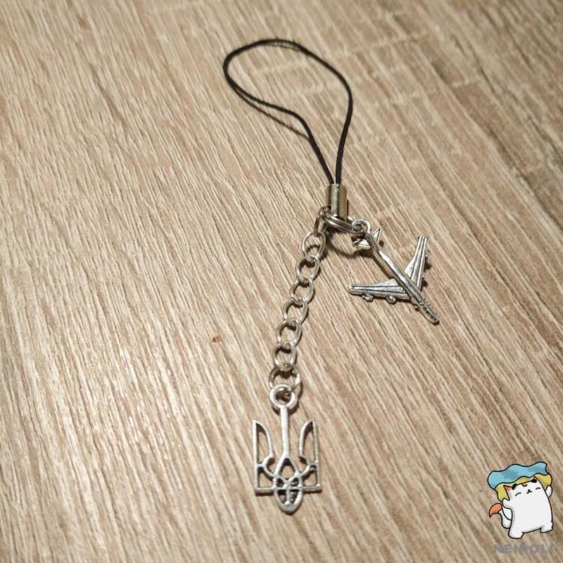 Брелок на мобільний герб україни 17*10 мм. тризуб та літак мрія міні. колір срібло