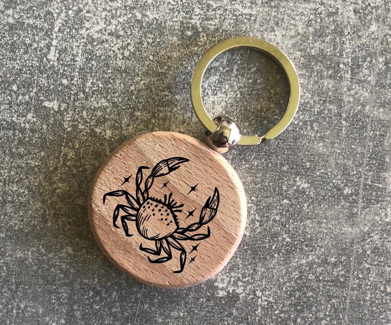 Круглый деревянный брелок диаметр 40 мм. с лазерной гравировкой изображением зодиакального знака «Рак» (Cancer) Арт. 15010204028
