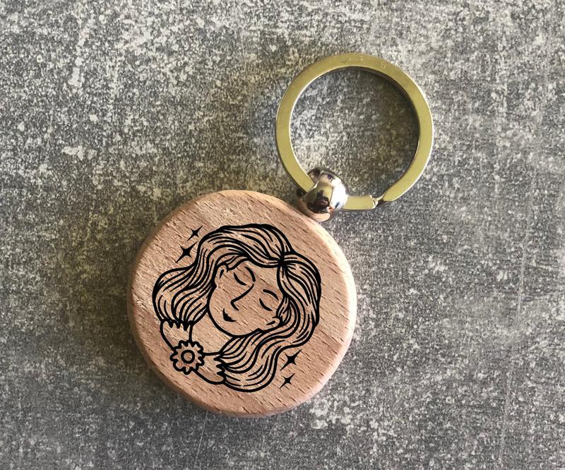Круглый деревянный брелок диаметр 40 мм. с лазерной гравировкой изображением зодиакального знака «Дева» (Virgo) Арт. 15010204030