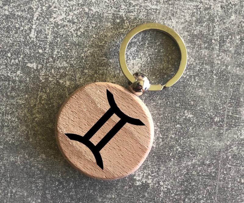 Круглий дерев’яний брелок з символом зодіака «близнюки»