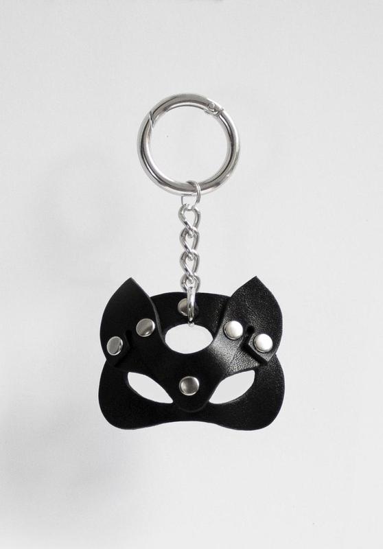 Брелок на сумку -- модный и привлекательный аксессуар, тем более, когда он столь необычный! Предлагаем купить брелок кошечку черный из натуральной кожи, украшенную хольнитенами (заклепками). Выглядит потрясающе! Невозможно пройти мимо такого брелока! Настоящая бдсм-маска кошечки, только в уменьшенном формате! Каждая деталь точно проработана, так что миниатюра полностью повторяет полноразмерную маску. Изготовлена из натуральной кожи растительного дубления. Фурнитура никелированная. Кольцо-карабин надежно фиксирует брелок там, куда вы захотите его повесить: на рюкзаках и сумках, ключах, ремнях и т.д.