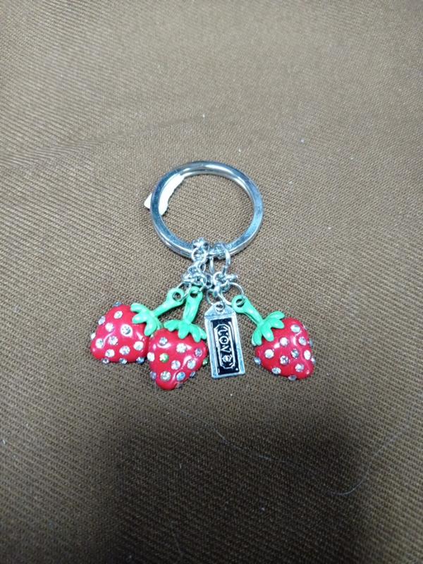 брелок с клубникой..маленькие ягодки с камушками..надписью.эмаль..металл.