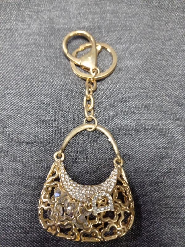 брелок сумочка..ажурная.внутри кристаллы прозрачные.камешки.темно желтый металл..ручка гнется.
