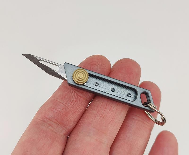 Брелок-нож на ключи (серый). Длина в сложенном виде 5,30 см., длина в выдвижном виде 7,30 см., длина лезвия ножа 2,20 см., ширина брелка 1,00 см., толщина 0,50 см., диаметр кольца 1,50 см., вес 7.08 грм., материал корпуса - анодированный алюминий, лезвие - стальное. Лезвие выдвигается с трехступенчатой фиксацией положения.
