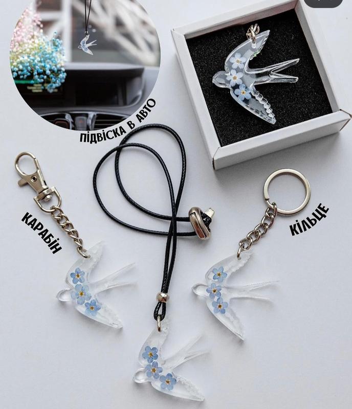 Нежные символичные подарки. Авторская коллекция птичек с настоящими цветами. Три птички: ластовица, синичка и голубика. Два цвета: полностью прозрачная и беленькая. Каждый изделие может быть как брелок или подвеска в авто. Ручная работа. По заказу, отправка на протяжении 4-6 дней.