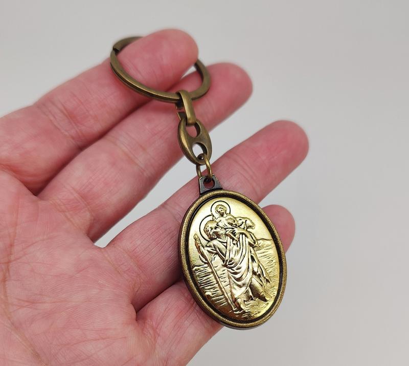 Брелок для ключей "Св. Христофор". Металл, размеры: длина общая 9,50 см., ширина 2,80 см., толщина 0,57 см., диаметр кольца 3,00 см., вес 17.90 грм., цвет - золото/бронза. Святой Христофор с посохом, несущий младенца Иисуса на своих плечах, считается покровителем моряков, военных, туристов и путешественников, грузчиков, водителей и плотников.