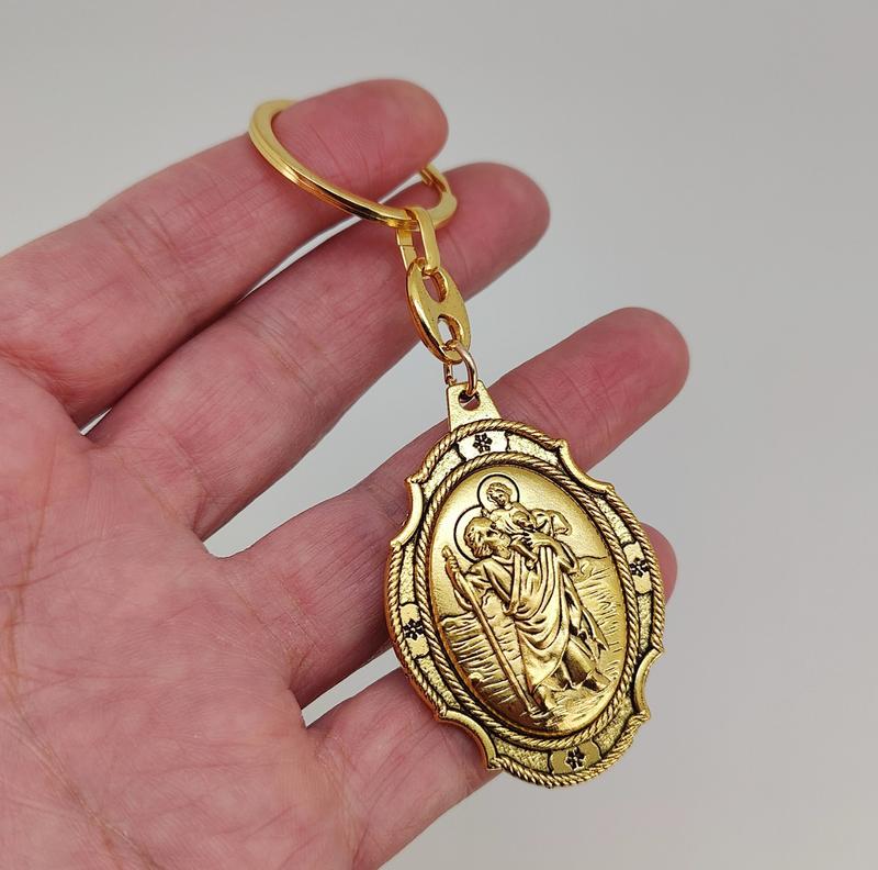 Брелок для ключей "Св. Христофор". Металл, размеры: длина общая 10,20 см., ширина 3,50 см., толщина 0,57 см., диаметр кольца 3,00 см., вес 17.90 грм., цвет - золото. Святой Христофор с посохом, несущий младенца Иисуса на своих плечах, считается покровителем моряков, военных, туристов и путешественников, грузчиков, водителей и плотников.