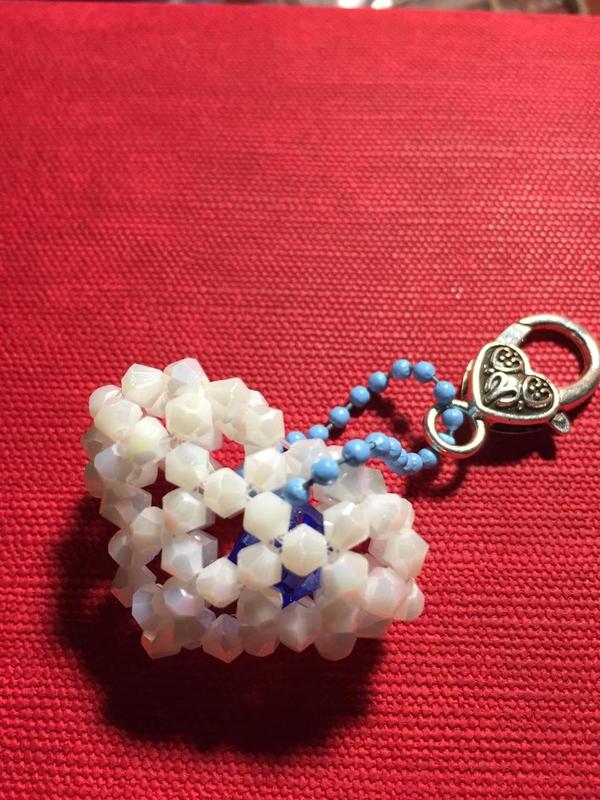 Брелок у формі серця з білих кришталевих намистин для сумки або ключів. Усередині блакитна намистина. Зроблю під Ваше замовлення будь-якого кольору та розміру