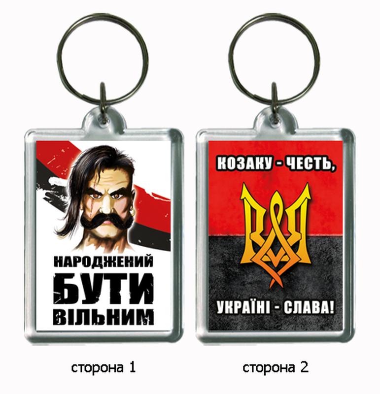 Брелок сувенирный акриловый двусторонний "Народжений бути вільним" с тризубом. Размер картинки - 35х50 мм. Фурнитура - кольцо с переходником.
