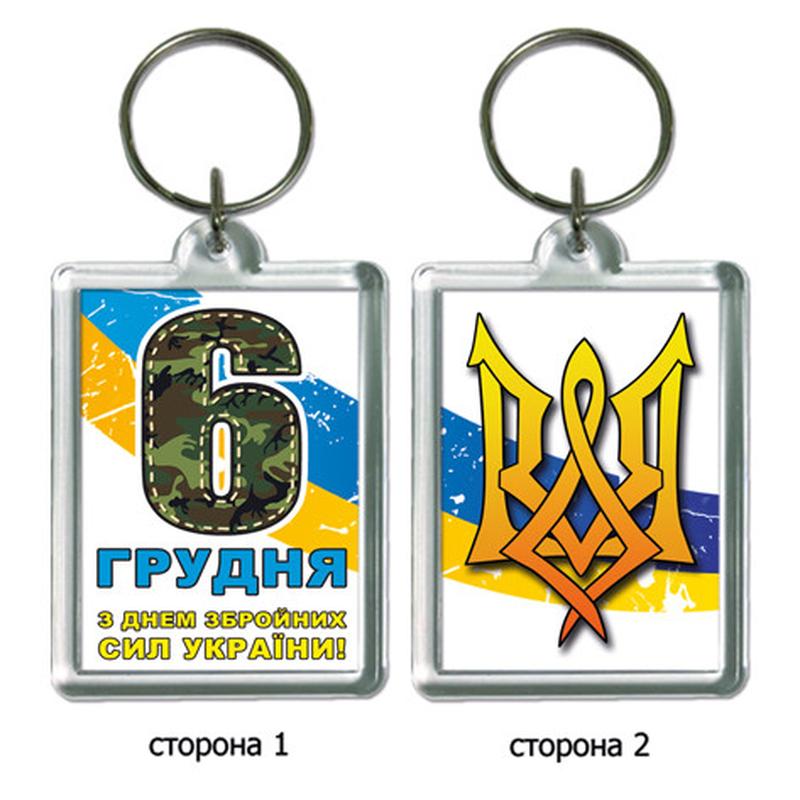 Брелок сувенирный акриловый двусторонний "6 грудня. З Днем Збройних Сил України" с тризубом. Размер картинки - 35х50 мм. Фурнитура - кольцо с переходником.