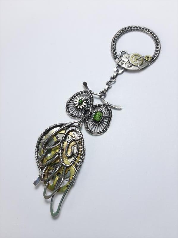 Серебряный брелок "Сова-стимпанк". Выполнен в технике Wire Wrap, из серебра 925 пробы, с использованием часовых механизмов. Брелок патинированный(искусственно почерненный химическим способом), отполированный. Размер брелока- 9х2,5 см. Кольцо- цельное. Возможно изготовление подобного кулона, или серег. Брелок очень дорого и красиво смотрится, это отличный и оригинальный подарок, а самое главное эксклюзивный. Дополнительные характеристики: Пол: Женский Пол: Мужской Материал : Бусины Материал : Серебро Товар под заказ