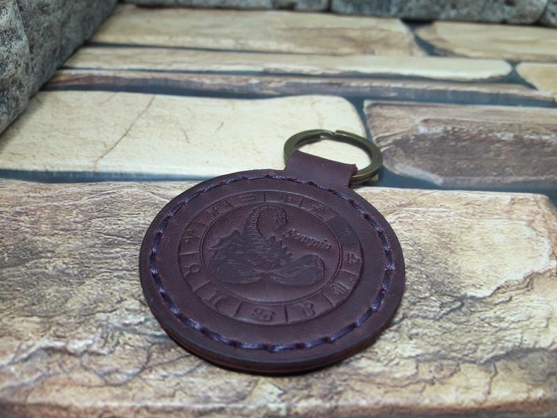 Брелок из натуральной кожи ручной работы. Круглый брелок знак зодиака "скорпион". Кожа крейзи хорс толщиной 1,4-1,6 мм. Два слоя кожи прошиты 1 мм вощеной нитью. Цвет кожи, нити и знак зодиака по выбору. Размер, включая кольцо 7,5 см*5 см. Дополнительные характеристики: Пол: Женский Пол: Мужской Материал : Натуральная кожа