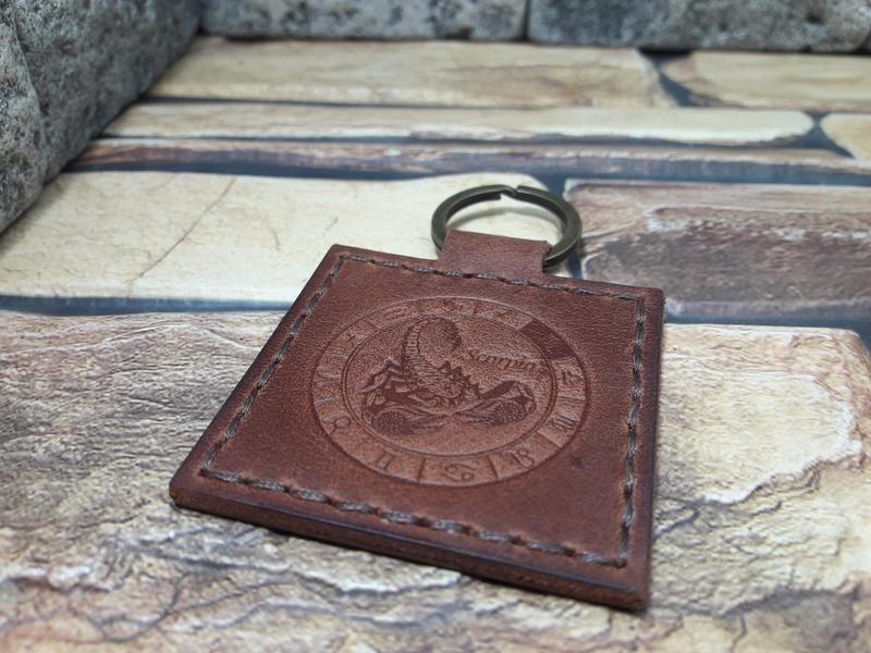 Брелок из натуральной кожи ручной работы. Квадратный брелок знак зодиака "скорпион". Кожа крейзи хорс толщиной 1,4-1,6 мм. Два слоя кожи прошиты 1 мм вощеной нитью. Цвет кожи, нити и знак зодиака по выбору. Размер, включая кольцо 7,5 см*5 см. Дополнительные характеристики: Пол: Женский Пол: Мужской Материал : Натуральная кожа