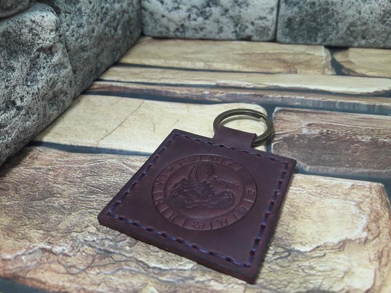 Брелок из натуральной кожи ручной работы. Квадратный брелок знак зодиака "скорпион". Кожа крейзи хорс толщиной 1,4-1,6 мм. Два слоя кожи прошиты 1 мм вощеной нитью. Цвет кожи, нити и знак зодиака по выбору. Размер, включая кольцо 7,5 см*5 см. Дополнительные характеристики: Пол: Женский Пол: Мужской Материал : Натуральная кожа