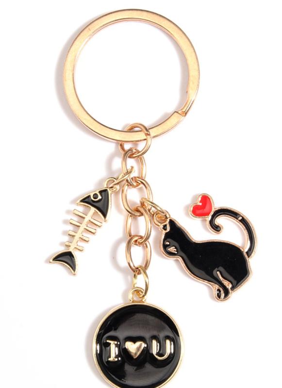 Брелок черный кот кошка металл эмаль рыбка и сердечко на хвостите