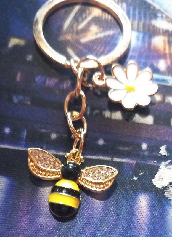 Брелок на ключи золотистый металл насекомое пчела пчелка ромашка цветок белый