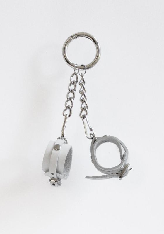 В качестве небольшого, но запоминающегося презента рекомендуем купить брелок наручники с пряжкой белый -- очень стильный и смелый аксессуар из натуральной кожи, который полностью повторяет полноразмерные наручники. Ремешок настоящий и расстегивается! Миниатюрная версия наручников изготовлена из натуральной кожи растительного дубления. Каждый наручник крепится к основному кольцу-карабину цепочкой и мини-карабином, поэтому можно носить только один наручник, а второй -- подарить своему партнеру в качестве символа. Кольцо-карабин надежно фиксирует брелок там, куда вы захотите его повесить: на рюкзаках и сумках, ключах, ремнях и т.д. Фурнитура никелированная.