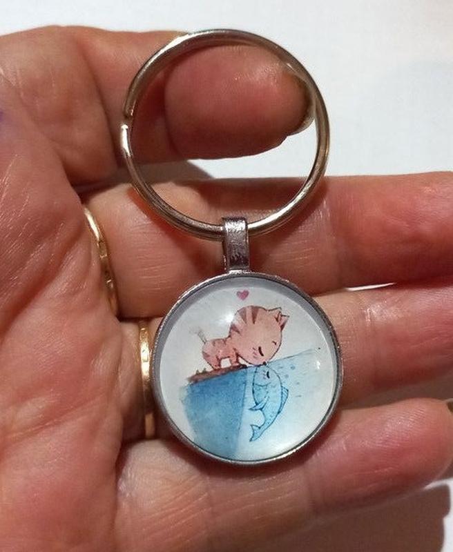 Брелок на ключи кот кошка и рыбка металл серебристый и стекло