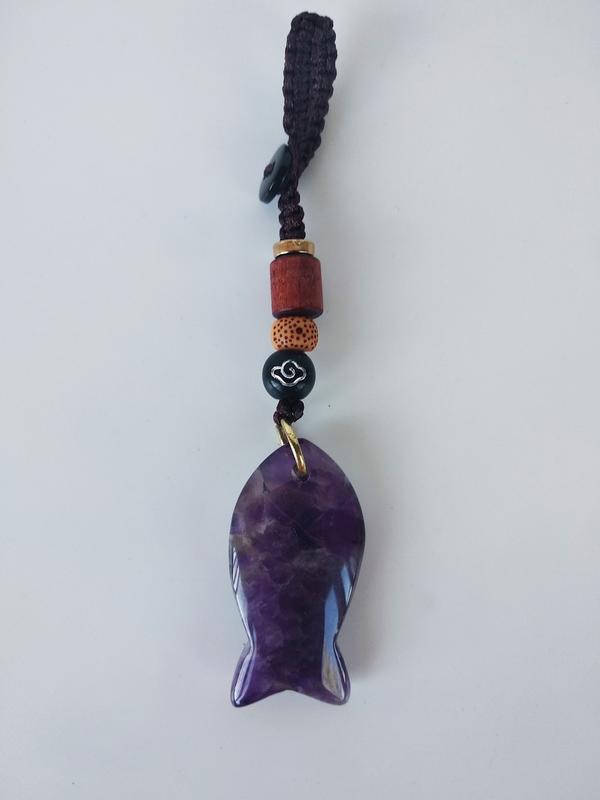 Брелок " Рыбка ", символ благополучия Описание: Натуральный камень: аметист, сандаловое дерево Размер камня: 36мм*20мм*0,7мм Камень по своему значению олицетворяет такие понятия как духовная чистота, преданность идеалам и непорочность мыслей. Он способен отогнать дурные мысли, укрепить сон, сохранить память и уберечь от порока пьянства и наркомании. Если обладатель самоцвета честен и бескорыстен, то камень принесет ему здоровье, счастливую жизнь, оградит от сглаза и черной магии.