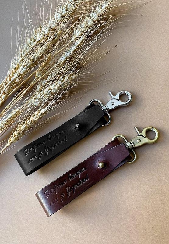 Пропонуємо до вашої уваги лімітовану серію брелоків з гравіюванням «Доброго вечора ми з України». Брелок виготовлений із натуральної ремінної шкіри. Ця шкіра надзвичайно міцна та зносостійка. Брелок із ремінної натуральної шкіри прослужить довгі роки. Прикрашає брелок нтиснення «Доброго вечора ми з України». Завдяки зручному карабіну шкіряний брелок можна легко пристібати та відстібати. Брелок «Доброго вечора ми з України» може стати чудовим подарунком для людини, яка любить і цінує нашу країну. Замовити брелок можна в чорному та коричневому кольорі. Кількість брелоків обмежена! Встигніть купити! Зверніть увагу! Ми можемо виготовити цей брелок з гравіюванням на замовлення. З можливістю нанесення будь-якого невеликого напису. Під замовлення брелок може бути виготовлено з натуральної шкіри краст будь-якого кольору Фурнітура та комплектація може бути змінена виробником