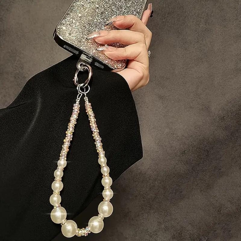 Брелок-браслет для телефона современная акцентная модель эффектно и стильно украсит ваш телефон удобен как аксесуар, брелок, уместно и удобно страхует телефон от падения На основе бижутерного сплава серебристого цвета большие разные бусины жемчужины(имитация) и бусины шамбала крепеж - карабин диаметр бусин до 1.6 см размер брелока - 14 см