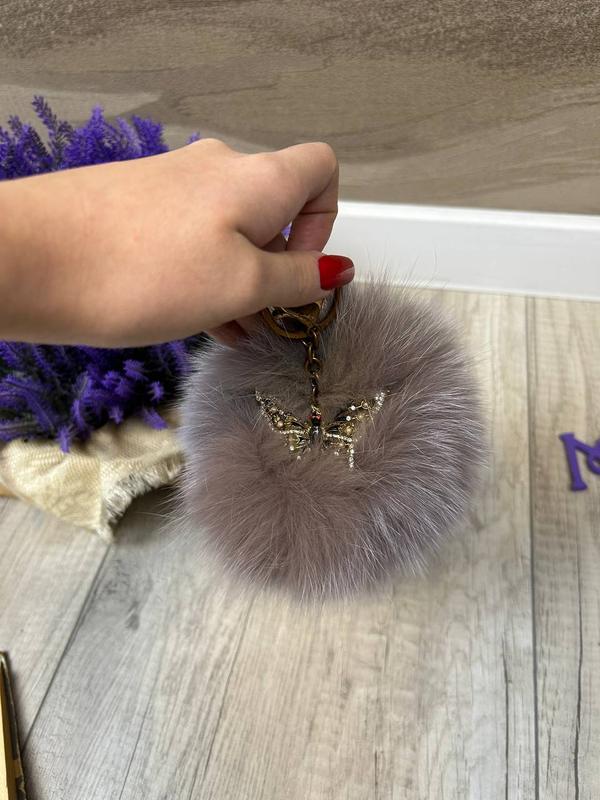 Меховый брелок помпон с песца с брошкой бабочка. Брошка в кристаллах, фурнитура золотистая. Отлично подойдет как брелок к связке ключей и как аксессуар для Вашей сумки или рюкзака. Состояние б/у в отличном состоянии Цвет серый Материал мех натуральный песец Размер помпона 15х15 см