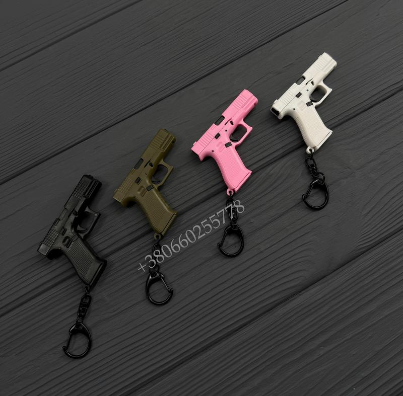 Тактичний брелок для ключів у вигляді пістолета Глок G45. В цьому брелку можна пересмикнути затвор, поставити на затримку, від'єднати магазин і навіть «вистрілити», натиснувши на курок (при цьому пролунає слабке клацання). Пістолет виготовлений повністю із пластику. Є койот, чорний, рожевий, білий.