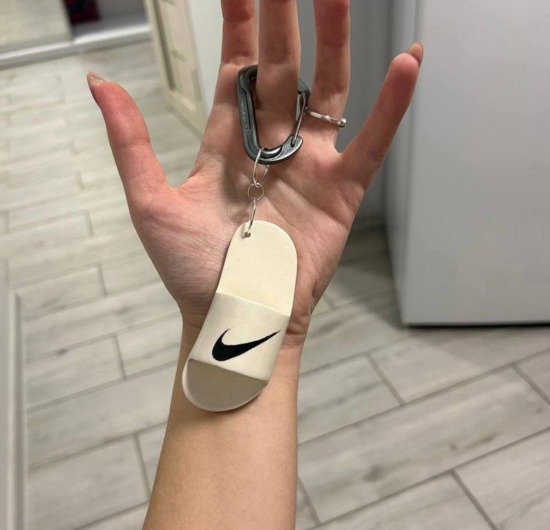 Уникальный брелок из глины ручной работы в виде шлепанца с логотипом Nike. Удобный никелевый карабин обеспечивает легкое крепление.