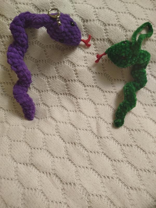 Очень красивые змейки, в форме брелка и подвески. Символ 2025 года и отличный подарок для ваших знакомых и близких. Брелок можно носить на сумке, подвеска будет прекрасно смотреться на новогодней елке. Длина фиолетовой змейки примерно 27 см, зеленой – 21 см. Более длинная игрушка изготовлена из плюшевой пряжи, та, что покороче - из велюровой, глаза на безопасном креплении. Можно изготовить в других цветах как с подвеской, так и с карабином. Смотрите мои другие объявления (имеются меньшие змейки-спиральки и змейки в новогодних шапочках). Цена может быть ниже, если заказывать несколько змеек.