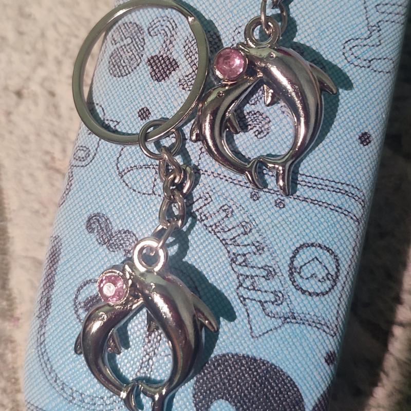 Брелок для ключей, подарок для нее, приятная мелкая, "Дельфины" с розовым камушком, размер 8.5 см, один 70 гривен, пара-120. Отличный подарочек на Валентина.