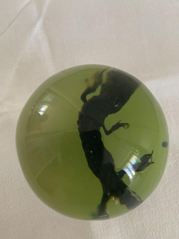 В идеальном стані, на деревʼяній підставці. В середині- ящірка