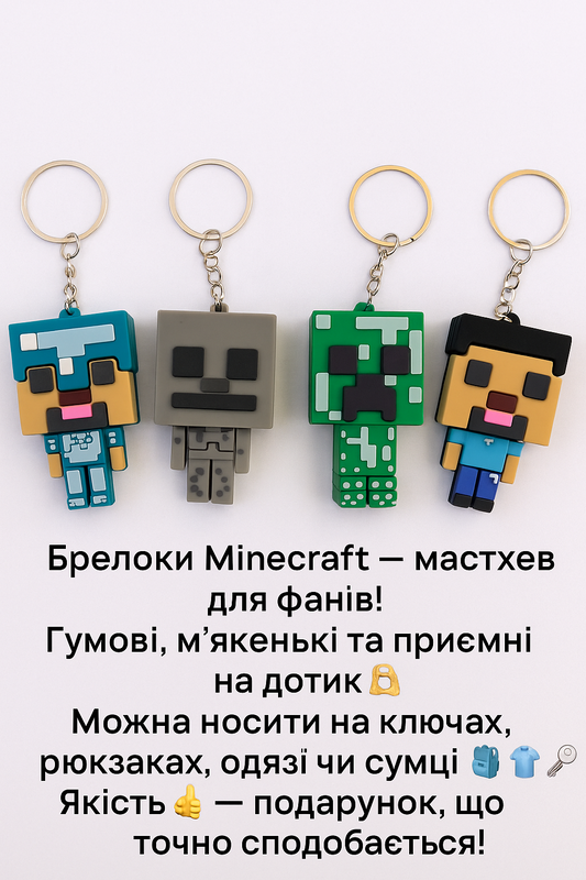 🏷️Брелоки Minecraft — мастхев для фанів! Гумові, мʼякенькі та приємні на дотик 🫶 Можна носити на ключах, рюкзаках, одязі чи сумці 🎒👕🗝️ 📐6 см. 💰150грн за шт. Якість 🔝 — подарунок, що точно сподобається! Який обереш собі? 💚