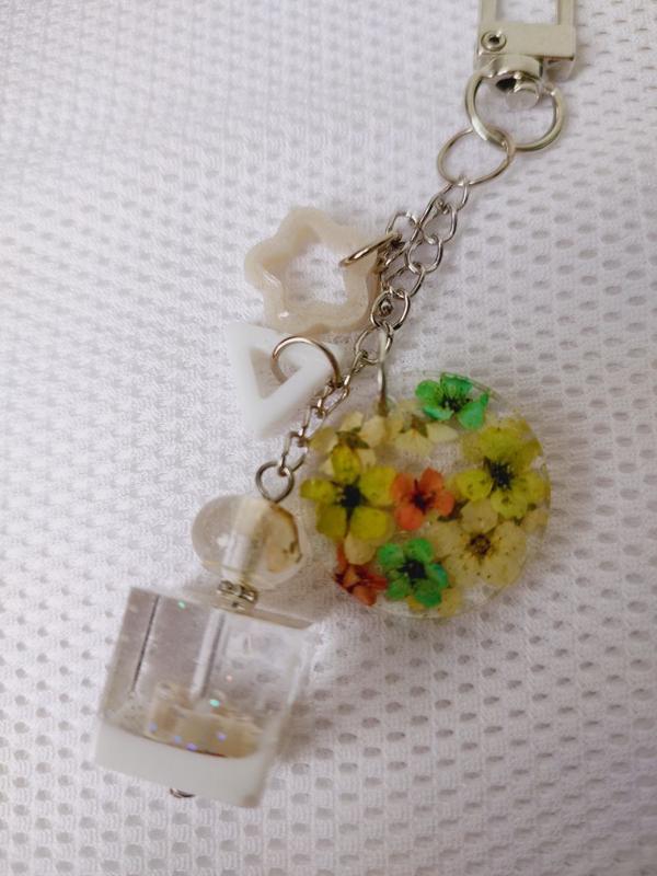 Брелок для ключей / подвеска на рюкзак Украшение ручной работы длиной 11,5см. Металлическая фурнитура серебристого цвета и декоративные подвески из эпоксидной смолы и сухоцветов.