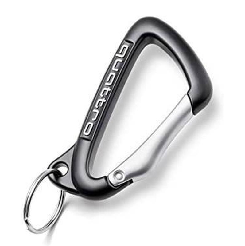 Серебристо-черный стальной брелок-карабин Audi quattro! Размеры: 10 х 5 см. Внимание: карабин не подходит в качестве альпинистского снаряжения.