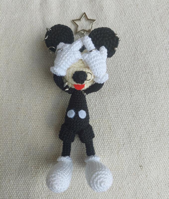 Стильный и дерзкий брелок Микки Маус с пирсингом на сумку в черно-белом цвете, связанный крючком, ручная работа Высота 14см
