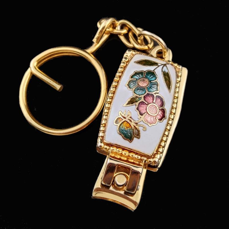 Увесистый позолоченный брелок для ключей. Клуазоне эмаль: цветок и бабочка. Брелок трансформируется в кусачки для ногтей и пилочку. Состояние отличное. Длина: 10,5см