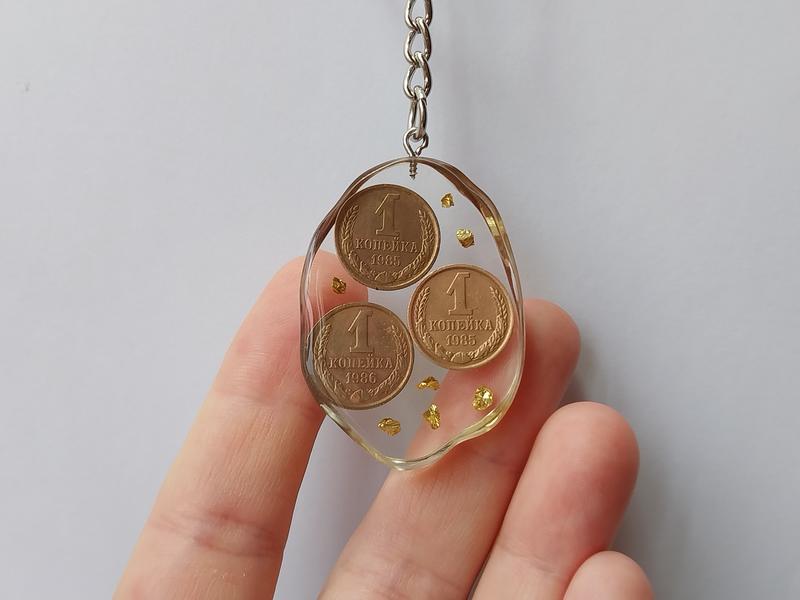 Подарок для нумизмата - брелок с монетами 1 коп СССР. В брелок из эпоксидной смолы добавлены монеты и декоративные камешки золотистого цвета. Ручная работа. Общая длина брелка 10 см.