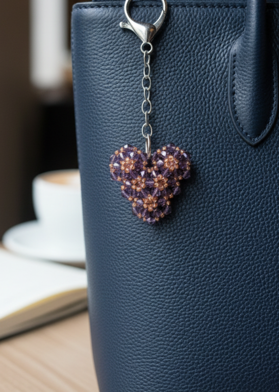 Брелок в форме сердца, выполненный вручную из бисера. Стильное сочетание фиолетовых и золотистых оттенков создает нежный, но выразительный аксессуар. Идеально подходит в качестве украшения для сумки, ключей или рюкзака. Такой брелок станет отличным подарком для близкого человека или стильным дополнением к вашему образу.
