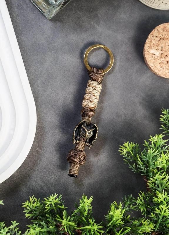 Брелок с кольцом и бусиной сова ручного литья из латуни в паракордовом плетении и оплеткой...