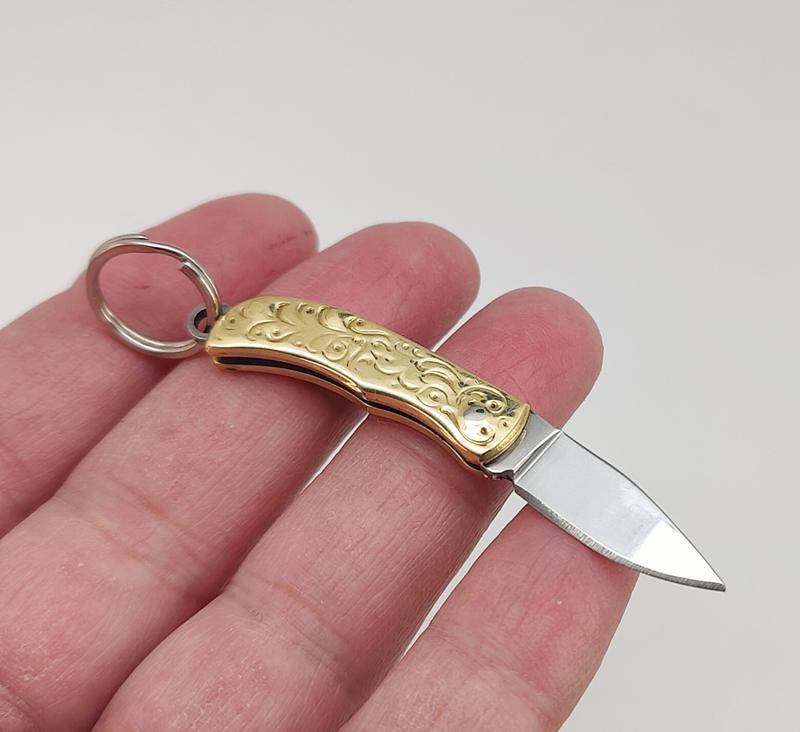 Брелок-нож на ключи (цвет - золото, материал - латунь/металл). Длина общая в сложенном состоянии 3,70 см., в открытом 6,40 см., ширина 1,20 см., толщина 0,60 см., длина лезвия ножа 2,60 см., вес 12.00 грм., диаметр кольца 1,00 см.
