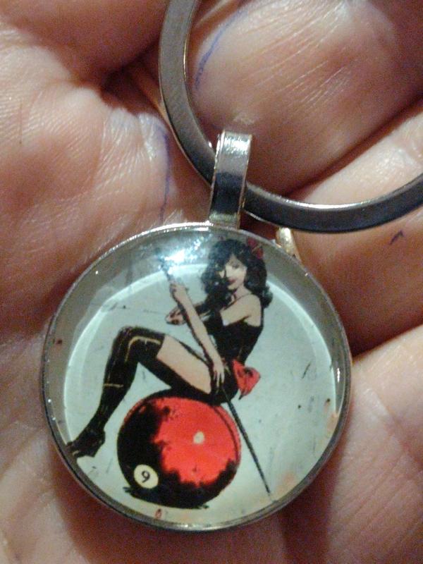 Круглий брелок на ключі сріблястий метал і скло більярд дівчина ретро