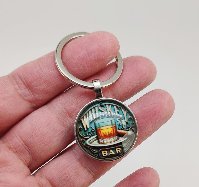 Брелок для ключей "Виски". Металл/оргстекло, цвет - серебро, размеры: длина общая 6,00 см., диаметр 2,80 см., вес 12.40 грм.