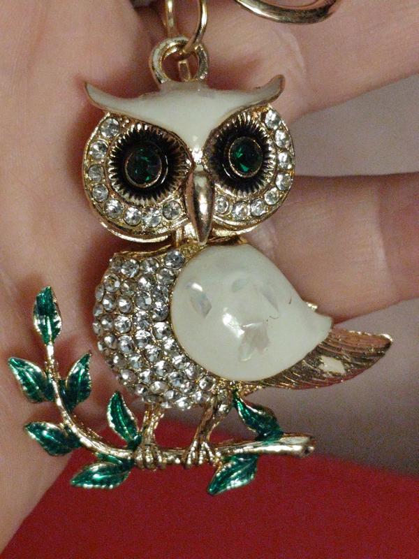 Брелок на ключи золотистый металл камни сова филин на ветке зеленой