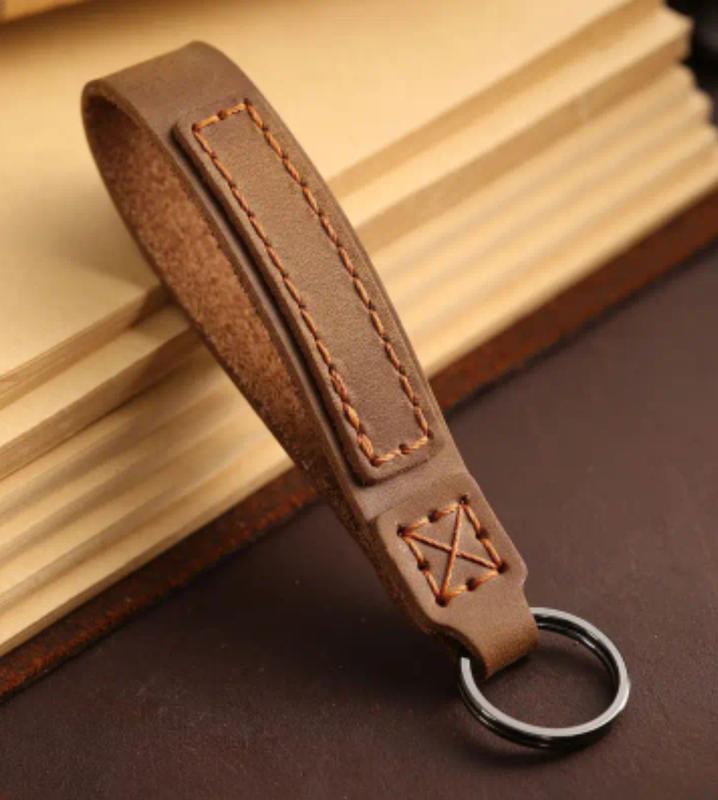 Брелок для ключей кожаный (цвет - коричневый). Длина брелка 10,00 см., ширина 1,50 см., вес 5.80 грм., диаметр кольца 2,00 см.