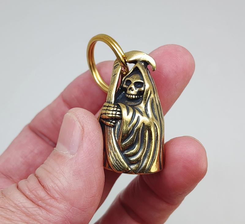 Брелок-колокольчик «Смерть с косой» из латуни, (издает четкий, высокотональный звон). Длина общая 4,70 см., диаметр колокольчика 2,20 см., вес 23.50 грм., диаметр кольца, также из латуни 2,00 см.