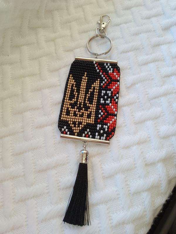 Брелки с национальной символикой - трезубом и вышивкой. Качественная серебристая фурнитура. Китяца из вискозниз нитей. Длина брелка полностью с карабином - 20 см. Длина бисерной вставки -,7,5 см. Ширина - 5 см.