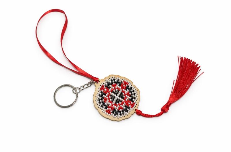 Брелок из бисера с орнаментом и красной кисточкой Стильный брелок ручной работы из бисера с геометрическим орнаментом в черных, белых и красных цветах. Центральный элемент выполнен на деревянной основе и украшен аккуратной бисерной вышивкой. Красная кисточка и лента добавляют изделию динамики и характера, делая его ярким акцентом для ключей, сумки или рюкзака. Брелок сочетает эстетику этно и современного стиля, подходит как для ежедневного использования, так и как символичный подарок близкому человеку. Характеристики: Материалы: чешский бисер, деревянная основа, текстильная кисточка, металлическая фурнитура Цвета: красный, черный, белый Техника: ручная вышивка бисером Тип: брелок для ключей / аксессуар на сумку Подойдет для: Подарок Украшения ключей, рюкзака или сумки Ценителей хэндмейд аксессуаров