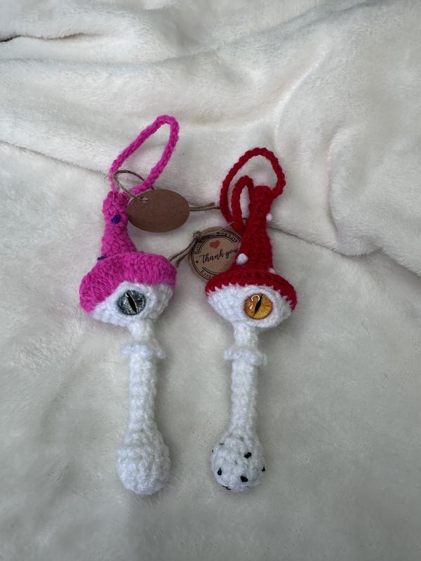 Брелочки в формі грибочків з оком. Вʼязані гачком в техніці амігурумі. Висота 12,5 см.
