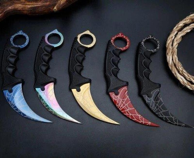 Очертания модели ножа керамбит CS GO хорошо знакомы всем поклонникам Counter Strike. Вогнутую геометрию клинка с выступом "skull crusher", которой обладает этот нож керамбит из CS GO, и стальное кольцо под палец игроманы узнают из тысячи возможных. Особую форму плоской ухватистой рукояти так же не спутать с другими: на ней имеются три крупные подпальцевые выемки, обеспечивающие возможность надежно держать нож как в прямом, так и в обратном хвате. Скольжение руки предотвращает множество крупных и мелких насечек. Настоящий нож керамбит из игры CS GO продается в специальном пластиковом чехле на длинном шнурке. Эта оригинальная модель будет интересна игроманам и коллекционерам Характеристики: Вес: 106 гр. Марка стали: 440 Общая длина: 188 мм. Наибольшая ширина клинка: 30 Цвет: Чёрный, золото, дамаск Длина клинка (мм): 90 Толщина обуха (мм): 3.8 Материал рукояти: пластик Чехол: пластик