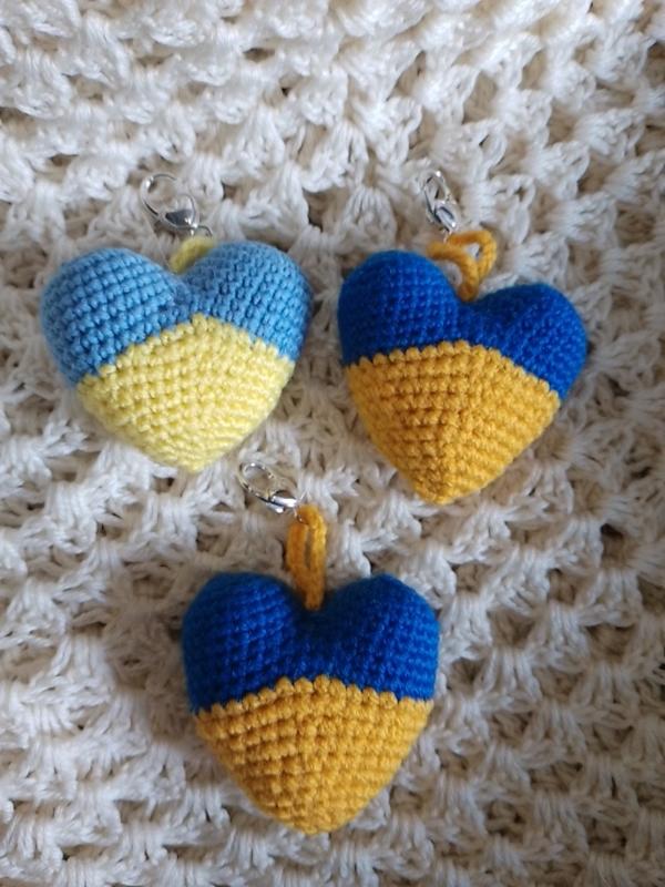 в'язані сердечка в кольорах прапора України.Брелки .